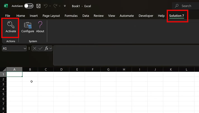 Activate Solution 7: Open Microsoft Excel, click "Solution 7" in the top header menu, then click "Activate" in the upper left corner of the screen (see image below). Solution 7 can only be used while it has been "activated".